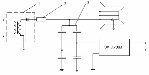 Рис. 5.2. Схема подключения прибора ЭМКС-58М: 1 – выпрямитель высокого напряжения; 2 – зарядное сопротивление; 3 – делитель высокого напряжения.