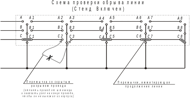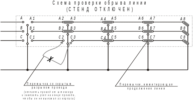 По заданию преподавателя собрать схему с оборывом в линии. Предварительно проводится проверка линии на обрыв: для этого все линии на конце кабеля объединяются с нейтралью и затем поочередно прозваниваются омметром (используется тестер). Пример см. рис. 5.4. Для усложнения задачи для учащихся допускается применение перемычек со скрытым разрывом соединительного провода, тем самым визуально нельзя обнаружить место обрыва и учащемуся необходимо проделать всю цепочку измерений для вынесения заключения о месте обрыва.