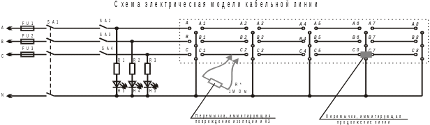 По заданию преподавателя собрать заданную схему с повреждением кабеля (на модели повреждение изоляции и кз в линии иммитируется перемычкой, содержащей резистор 1-2МОм!; при кз линии на землю - перемычкой с резистром 1-2МОм! соединяют фазу и нейтраль; при кз между линиями - перемычку с резистром 1-2МОм! устанавливают между фазами; обрыв в линии иммитируется отсутствием перемычки между участками кабеля).