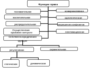 Существуют следующие функции права: познавательная, коммуникативная, воспитательная, идеологическая, регулятивная (статическая и динамическая), охранительная, распределительная (дистрибутивная), функция разрешения правовых конфликтов, осуществления правового контроля и легитимационная.