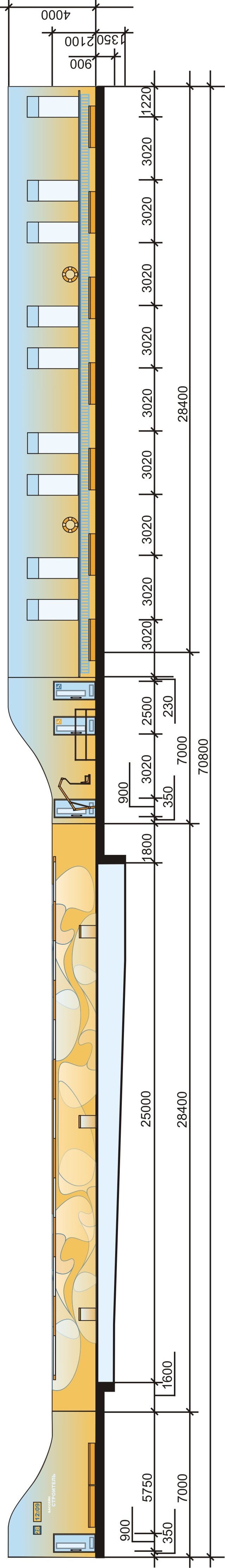 Параллельно с центральными светильниками на двухуровневом потолке в вестибюле размещены неоновые голубые подсветки, дающие мягкий свет в интерьере. Неоновые подсветки также удачно вписались в рельефы и главный конструктивный элемент – спортивные вышки. Вышки сконструированы по форме напоминающие нарастающие волны. Необычная форма вышек ярко подчеркнута контрастным цветом и неоновой подсветкой, все это делает элемент, несомненно, главным в большой ванне. В целом интерьеры бассейна построены на контрасте, что создает некую динамику и живость: это диванчики в вестибюле, зрительские места, стены, потолок, конструктивные элементы, все это подробно можно проследить по разрезам (Рисунки 30 – 32) и разверткам (Рисунки 33, 34).