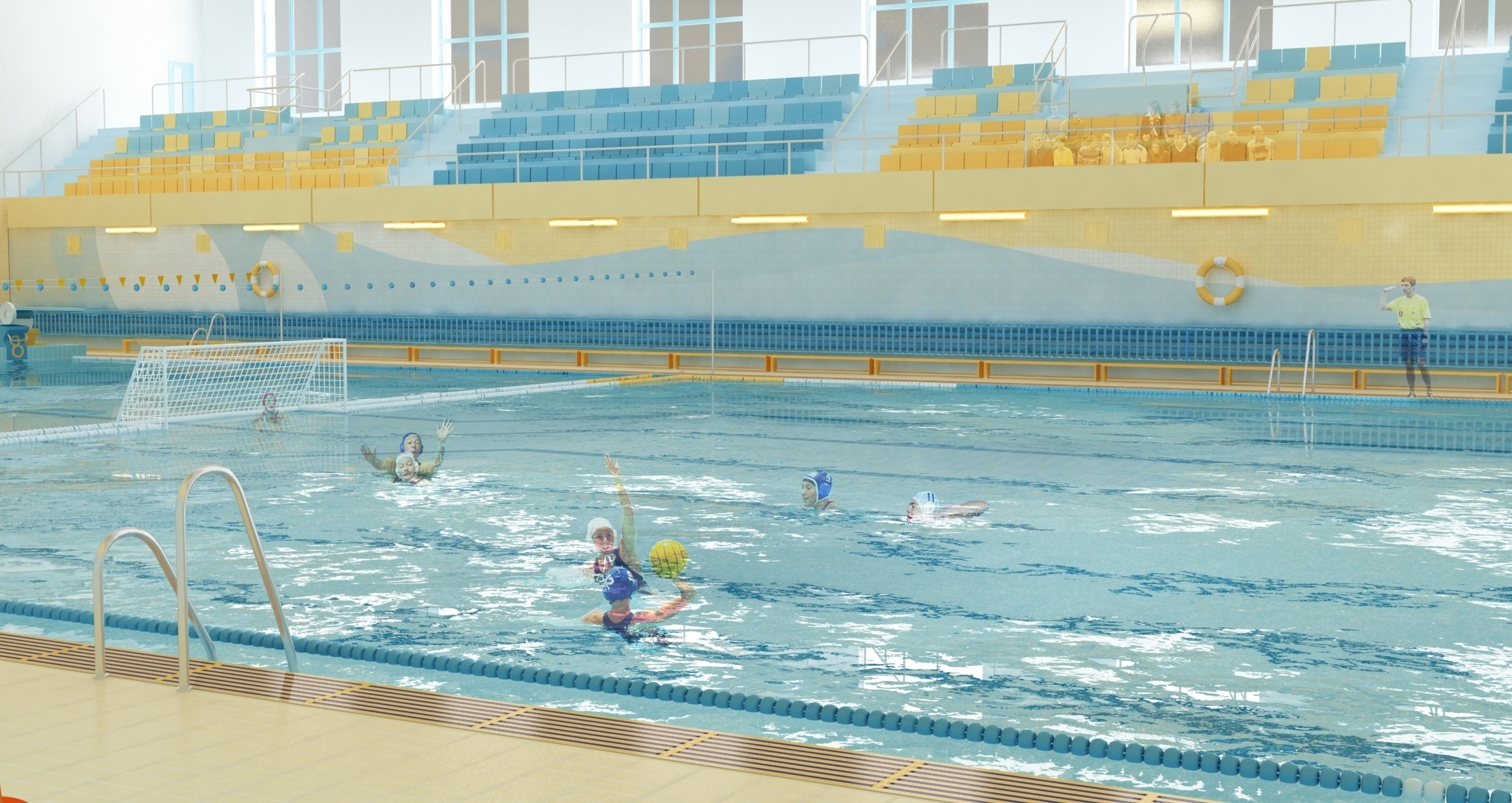 Перепланировка помещений выполнена на всех этажах. Второй и третий этажи подверглись меньшей перепланировке. На втором этаже убран балкон, находящийся в тренажерном зале, который не давал присутствующим на нем достаточного обзора большой ванны. Для VIP-персон и судей выделены на трибуне специальные места со встроенными мониторами, а также сделаны мини-подиумы, где проводится съемка. Зрительские места находятся в пролете третьего этажа. Лестничный марш левого крыла оборудован специальными поручнями и подъемником для инвалидов. Правое же крыло оставлено без изменений. Зрительские места для инвалидов размещены на специально оборудованной площадке выше зрительских мест. Все левое крыло специально организовано для инвалидов – все удобства рядом: подъемники, бассейны малый и средний, специально построенная небольшая раздевальня с душевой, туалеты, зрительские места и игровые залы.