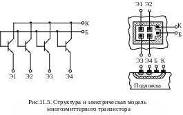 Многоэмиттерный транзистор (МЭТ) отличается от обычных биполярных транзисторов наличием нескольких (обычно четырех) эмиттеров (рис. 11.5), объединенных общей базой. Эмиттеры расположены так, что непосредственное взаимодействие между ними через область базы практически отсутствует. Поэтому многоэмиттерный транзистор можно рассматривать как совокупность нескольких независимых транзисторов с объединенными коллекторами и базами. Но в отличие от такой сборки он занимает меньшую площадь на кристалле и имеет малые паразитные емкости. Кроме того, в инверсном режиме коэффициент передачи тока Вi очень мал (0,05...0,005).