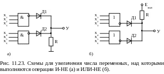 При использовании элементов ИЛИ-НЕ с диодной схемы И (рис. 11.23,б) расширяется число переменных для операции ИЛИ-НЕ: