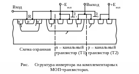Реальная схема инвертора отличается от схемы ключа на комплементарных МОП-транзисторах (рис. 10.12,а), рассмотренной в 10.4.2, лишь наличием защиты входов, являющихся внешними выводами ИС (рис. 11.19).