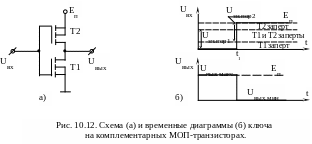 Схема и временные диаграммы работы ключа на комплементарных МОП-транзисторах приведены на рис. 10.12. В нем затворы транзисторов объединены, исток Т1 подключен к общей шине, а исток Т2 − к шине источника питания Еп.