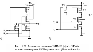 Логические элементы других типов строятся на основе базовых инверторов путем измерения топологии соединений их транзисторов на кристалле ИС. Так, для получения элемента ИЛИ-НЕ n-канальные транзисторы соединяются параллельно, a р-канальные последовательно (рис. 11.22,а), для элемента И-НЕ наоборот − n-канальные последовательно, а р-канальные параллельно (рис. 11.22,б). Образуется два яруса транзисторов относительно выходного вывода. Как и в отдельном инверторе, здесь при любой комбинации входных сигналов в установившемся режиме ток от источника питания практически отсутствует, так как один из ярусов всегда закрыт. Например, для ЛЭ ИЛИ-НЕ нижний ярус закрыт при наличие на всех входах сигналов логического нуля, а при других комбинациях закрыт верхний ярус. В логическом элементе И-НЕ состояния транзисторов противоположны.