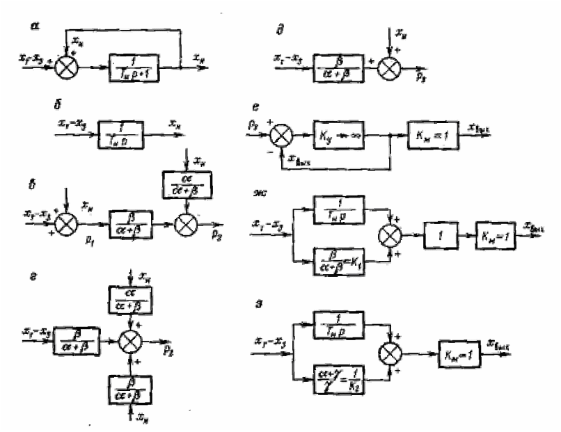 Сигнал хТ, пропорційний поточному значенню регулюючого параметра, проходить блок передування, що включає підсилювач — елемент порівняння І і інерційну ланку II (, Vi), і поступає на вхід суматора на опорах IV. Туди ж поступає сигнал хЗ, пропорційний заданому значенню регулюючого параметра. Одночасно сигнали хТ і хЗ поступають на вхід інтегрального блоку (суматор IX). Вихідний сигнал інтегрального блоку хІ (з виходу повторювача X) і вихідний сигнал хвих суматора VI поступають на вхід суматора на опорах V.