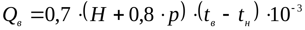 Втрати теплоти , кВт, на нагрівання зовнішнього повітря, проникаючого у вхідні вестибюлі будівель через зовнішні двері за відсутності легко-теплових завіс і одному вхідному тамбурі слід розраховувати по формулі: