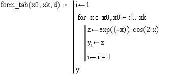 Приклад 1.11. Трохи змінимо умови приклада 3.5 , а саме : значення х, для яких обчислюється функція y(x) задається вектором x, що має n компонент. Для кожної компоненти вектора х обчислити значення функції f(x)=e-x Cos(2x) і записати це значення у відповідну компоненту вектора y.