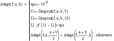 використовуючи формулу Симпсона з автоматичним вибором числа вузлів. При цьому програма-функція Simpson(f,a,b,N) обчислює визначений інтеграл по формулі Симпсона при фіксованому числі інтервалів N, а програма-функція Adapt(f,a,b) вибирає по заданій точності обчислення інтеграла ( рівної 10-8 ) кількість інтервалів.