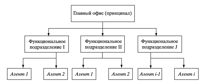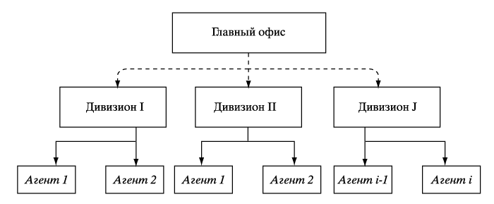 Холдинговая структура (рис. 4) представляет собой иную крайность – максимальную децентрализацию процесса принятия решений. Высшее руководство фирмы в этом случае оставляет за собой лишь полномочия по контролю финансовых потоков и финансовых результатов действия агентов.