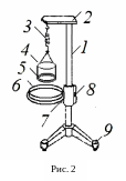 Установка представляет собой вертикальную стойку 1, на которую нанесена шкала с делениями. На кронштейн 2 стойки подвешивается пружина 3 с тонкостенным кольцом 5. Над кольцом имеется диск 4, служащий визиром для отсчета по шкале и одновременно платформой для разновесов. Вдоль стойки с помощью винтов 8 можно плавно перемещать столик 7, на котором помещают кювету 6 с исследуемой жидкостью.