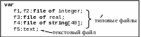 Для использования файла данных в программе нужно в разделе VAR описать файловую переменную (ф/п), в которой будет храниться информация об этом файле (полное имя, длина, дата и время создания и т.д.). Это описание различно для разных типов файлов. Например: