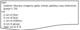 Переменная, содержащая множество объявляется в разделе VAR с помощью описателя Set Of, после которого указывается базовый тип. Например: