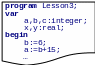Переменные одного типа перечисляются через запятую. После этого списка ставится двоеточие и указывается идентификатор типа. В данном примере имеются два идентификатора: integer и real. Первый обозначает целые переменные в диапазоне от -2147483648 до +2147483647 и занимает в памяти 4 байта. Второй – вещественные (дробные). Диапазон его значений от ± 5.0∙10-324 до ± 1.7∙10308. Число типа real содержит 15-16 значащих цифр и занимает в памяти 8 байт.
