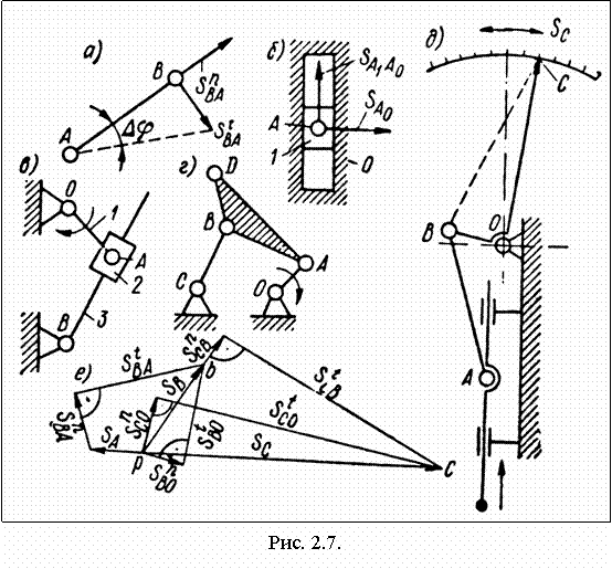 Пример. На рис. 2.7, д, е показаны схема механизма прибора и построение плана малых перемещений. Считаем, что шарнир О совпадает со своим теоретическим положением. Заданы по величине и направлению первичные ошибки: перемещение направляющей ползуна SA и нормальные перемещения SnBA;SnBO. От полюса плана р откладываются перемещения точек механизма относительно стойки.