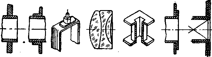 На рисунке приведены соединения, выполненные с помощью замазок. Этот способ соединения в точной механике применяется сравнительно редко, главным образом для придания корпусам приборов надлежащей герметичности и для крепления некоторой мелкой арматуры — уровней, стекол в металлических деталях — или, наоборот, для закрепления металлических мелких деталей (гаек, болтов, цоколей и т. д.) в неметаллических материалах — камне, стекле, мраморе.