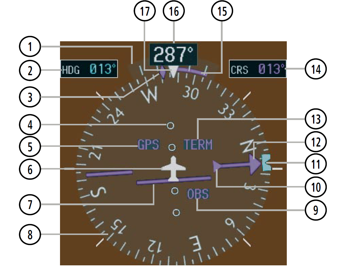 Заданный КУРС (COURSE) показывается вверху справа от НПП. Цвет цифр заданного КУРСА соответствует выбранному навигационному источнику: фиолетовый для GPS и зеленый для режима NAV (VOR или LOC).