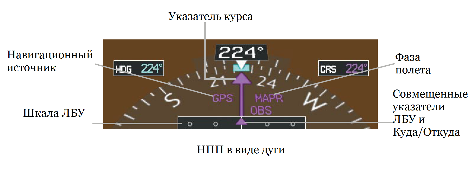 НПП в виде 3600 компаса содержит индикатор линейного бокового уклонения ЛБУ (CDI) с указателем курса, указателем куда/откуда, шкалой ЛБУ и подвижным указателем ЛБУ.