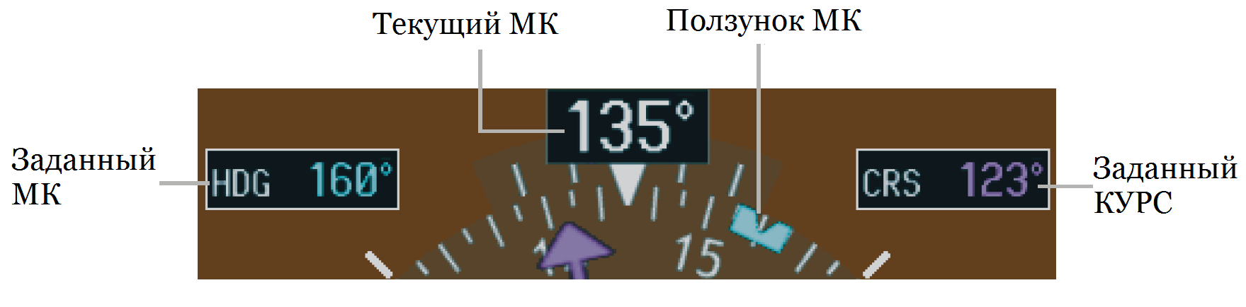 Заданное направление продольной оси самолета (МК или ИК) показывается вверху слева около НПП и отображается светло-синим цветом. Светло-синий ползунок Heading на компасном диске соответствует выбранному направлению продольной оси (МК или ИК).