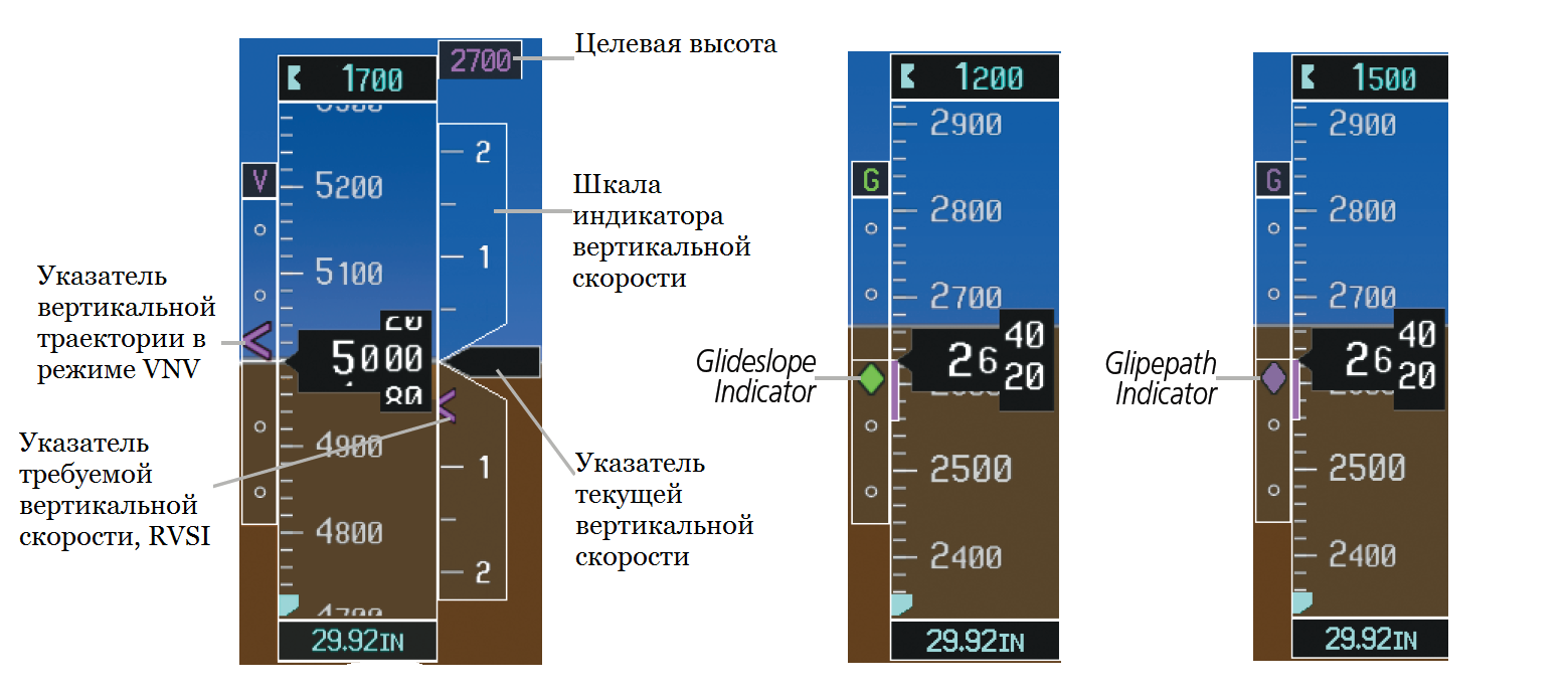 Фиолетовая галочка RVSI (индикация требуемой вертикальной скорости) показывается на шкале сбоку, когда в режиме VNV происходит снижение по траектории. Появляется эта галочка на шкале за 1 минуту до достижения точки начала снижения по маршруту. В разделах «Управление полетом» и «Система автоматического управления полетом» более подробно описана работа в режиме VNV вертикальной навигации.