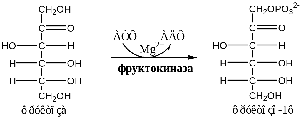 1. Фруктокиназа (АТФ: фруктоза-1-фосфотрансфераза) фосфорилирует только фруктозу, имеет к ней высокое сродство. Содержится в печени, почках, кишечнике. Инсулин не влияет на ее активность.