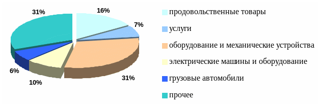 Также импорт в 1999 г. был представлен продукцией химической промышленности (5%), текстилем, изделиями из него, обувью (4%), минеральными продуктами, включая топливно-энергетические товары (2%), древесиной и целлюлозно-бумажными изделиями (1%). По этим группам также наблюдалось сокращение объемов импорта.