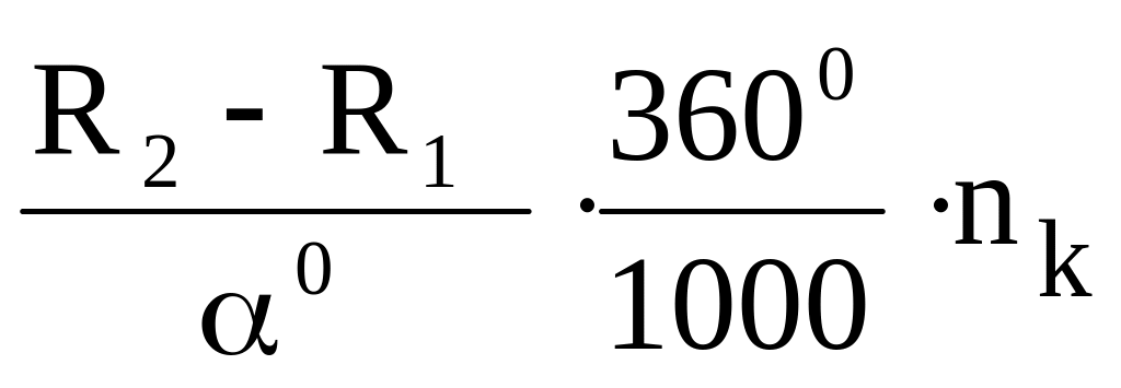 де R1 i R2 – радіуси дуг кривих підйому кулачка; 0 – кут ділянки, яку охоплює крива; nk – кількість обертів кулачка за хвилину. |