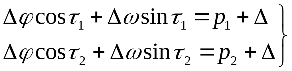 Δφ (cos τ1 − cos τ2 ) + Δω ( sin τ1 − sin τ2 ) = р1 − р2 .