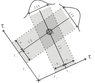 Точность обсервованного места зависит от точности измеренного навигационного параметра. Для выяснения этой зависимости выполним графическое построение линий положения, но уже с учетом погрешностей в навигационных параметрах. На рис. 6.1 показана счислимая точка С, обсервованная точка F и две линии положення, которые проходят через определяющие точки к1 и к2. Переносы, с помощью которых получены линии положения, имеют случайные погрешности, которые оцениваются СКП − тлп1 и тлп 2 . Это означает, что изображенные на рисунке линии положения являются наиболее вероятными, но могут проходить и в другом месте. Кривые нормального закона распределения также показаны на рисунке. Обсервованная точка получена на пересечении наиболее вероятных линий положения, но в действительности может быть и в другом месте.