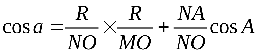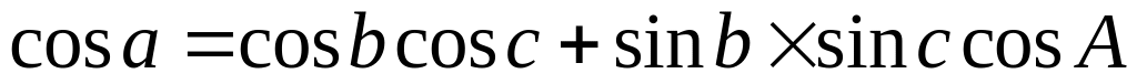 Формула косинуса стороны читается так: в сферическом треугольнике косинус стороны равен произведению косинусов двух других сторон плюс произведение синусов этих сторон на косинус угла между ними (... на косинус угла, противолежащего исходной стороне).