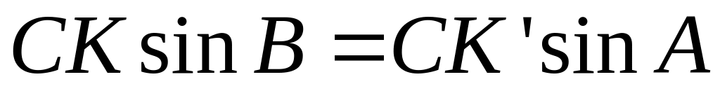 Так как в двух других плоских прямоугольных треугольниках СКО и СК'О стороны СK и СК' являются катетами, то: СК = R sin а; СК' = R sin b. После подстановки в формулу получим R sin a sin В = R sin b sin А, или