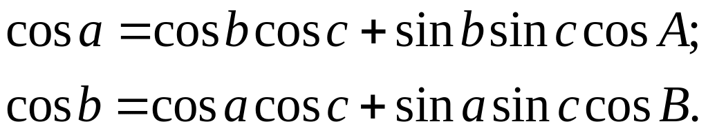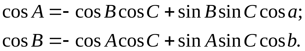 Последние две формулы приведены без вывода. Читается формула косинуса угла следующим образом: косинус угла сферического треугольника равен отрицательному произведению косинусов двух других углов плюс произведение синусов этих углов на косинус стороны между ними (... на косинус стороны, противолежащей исходному углу).