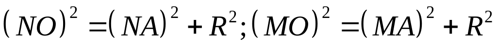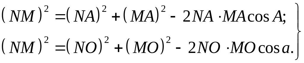 Дважды используя теорему квадрата стороны плоского косоугольного треугольника, найдем сторону NМ сначала из треугольника NAM, а затем из треугольника NOM: