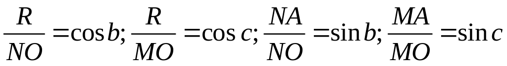 Формула косинуса стороны (теорема косинусов). Построим сферический треугольник ABC и трехгранник с вершиной в точке О (рис. 2.4). В вершине А проведем касательные к сторонам b и с треугольника. Касательные пересекутся в точках N и М с продолженными ребрами трехгранника. Заметим, что все три ребра трехгранника равны радиусу R сферы.