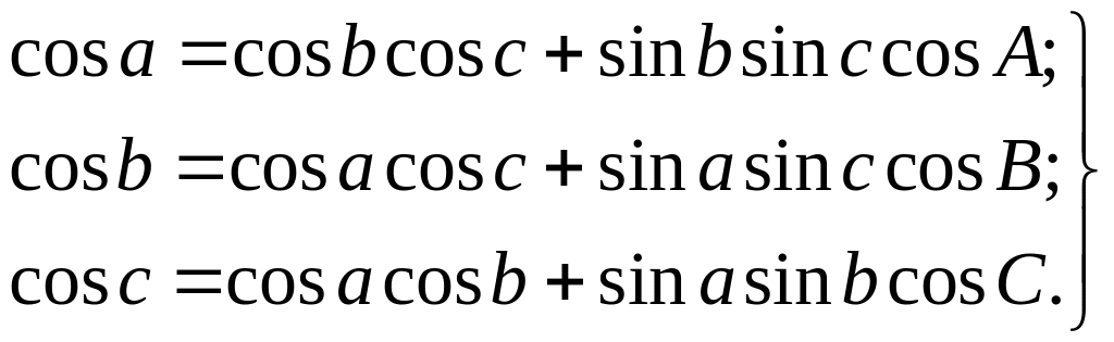 Зависимости между элементами сферического треугольника, выражаемые первыми тремя формулами, называют теоремами.