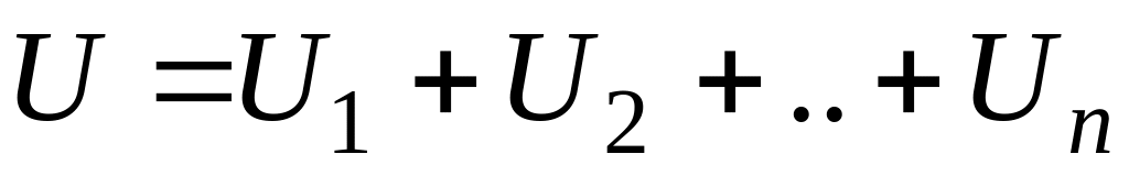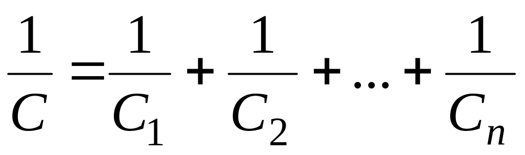 Нехай послідовно з'єднано N конденсаторів (рис. 4.1.18). На обкладках кожного конденсатора буде однаковий за модулем заряд, тобто, q1 = q2 = … = qN = Q, де Q - заряд обкладок всієї батареї. Напруга на клемах такої батареї дорівнюватиме сумі напруг на всіх послідовно з'єднаних конденсаторах, тобто: