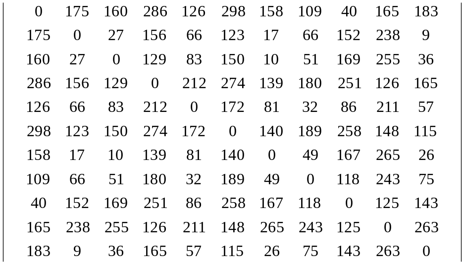 В данной работе составляется матрица весов и матрица кратчайших расстояний. Для этого рассчитывается в прямоугольной системе координат по формуле (1):