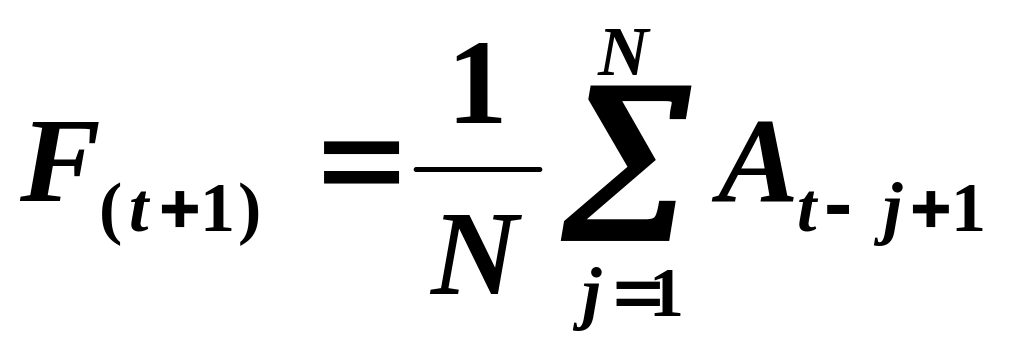 Скользящее среднее – это метод, позволяющий упростить анализ тенденции за счет сглаживания колебаний измерений по временным интервалам. Эти колебания могут возникать из-за случайного “шума”, который часто является побочным эффектом техники измерения. Например, измерения атмосферного давления будут зависеть и от точности барометра, и от того, насколько внимательно исследователь будет фиксировать показания прибора. Однако можно выполнить ряд измерений, затем сгладить их по отрезкам времени и построить окончательную кривую, которая будет более точно отражать фактическое значение атмосферного давления. Используется для расчета значений в прогнозируемом периоде на основе среднего значения переменной для указанного числа предшествующих периодов. Каждое прогнозируемое значение основано на формуле: