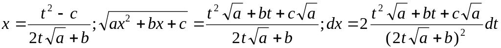 Сначала рассмотрим случай, когда квадратичный трехчлен ax2 + bx + c имеет комплексные корни. В этом случае знак квадратного трехчлена совпадает со знаком а, и поскольку по смыслу квадратный трехчлен (из которого извлекается квадратный корень) положителен, то а >0. Таким образом, мы имеем право сделать следующую подстановку