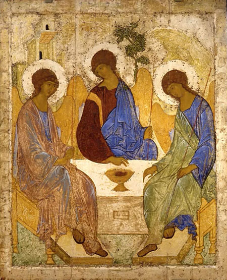 чина («Спас», «Апостол Павел», «Архангел Михаил»— рубеж 14—15 вв., Третьяковская галерея), где лаконичные плавные контуры, широкая манера письма близки приёмам монументальной живописи. В конце 14 — начале 15 вв. Рублёв создал свой шедевр — икону «Троица» (Третьяковская галерея). Традиционный библейский сюжет Рублёва наполнил глубоким поэтическим и философским содержанием. Отойдя от традиционных канонов, он поместил в центре композиции единственную чашу (символизирующую жертвенную смерть), а её очертания повторил в контурах боковых ангелов. Центральный (символизирующий Христа) ангел занял место жертвы и выделен выразительным контрастом пятен темно-вишнёвого и голубого цветов, оркестрованным изысканным сочетанием золотистых охр с нежным «голубцом» и зеленью. Вписанная в круг композиция пронизана глубокими круговыми ритмами, подчиняющими себе все линии контуров, согласованность которых производит почти музыкальный эффект. «Троица» рассчитана на дальнюю и ближнюю точки зрения, каждая из которых по-разному раскрывает богатство оттенков, виртуозную работу кисти. Гармония всех элементов формы является художественным выражением основной идеи «Троицы» — самопожертвования как высочайшего состояния духа, созидающего гармонию мира и жизни.