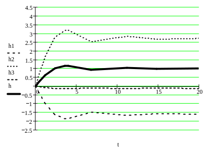 По методу трапеций построим переходной процесс. Разобьем вещественную функцию на три трапеции и для каждой трапеции запишем h-функцию.