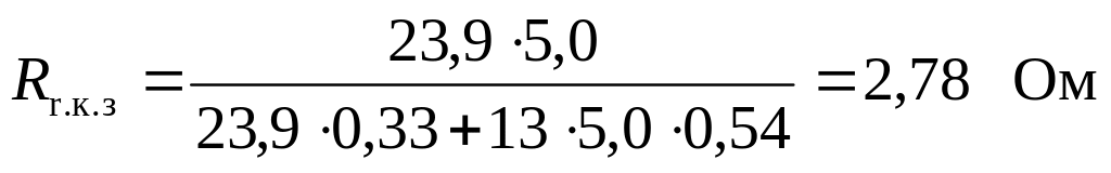 Рассчитанное сопротивление искусственного контурного заземления больше, чем Rи = 2,78 Ом, поэтому принимаем решение увеличить в контуре заземлителя количество вертикальных заземлителей до 13 шт. Затем вновь по табл. 3.2 находим коэффициенты использования ст = 0,54 и пол = 0,33 при a/l = 1 и вычисляем: