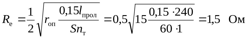 где rоп – принятое сопротивление заземления одной опоры, Ом; nт – количество тросов на опоре, принимаем nт = 1 шт., rт – активное сопротивление грозозащитного троса на длине одного пролета, определяется: rт = 0,15lпрол/S, Ом; lпрол – длина троса в пролете между опорами; S – сечение стального троса, мм2.