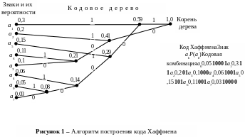 Наглядным представлением алгоритма построения кода Хаффмена является построение кодового дерева. Кодовое дерево состоит из узлов и веток (рис. 1). Оно строится путем выполнения последовательности следующих процедур.