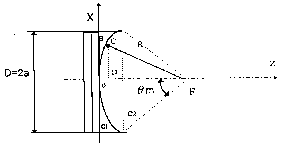 Рівняння твірної поверхні складається з умови рівності часу приходу променів у фокус лінзи. Взявши два промені - один осьовий OF, а другий довільний (наприклад BCF), зрівнюємо час пробігу звукових хвиль: