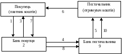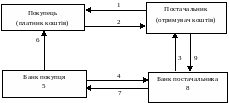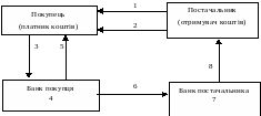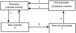 1 – постачальник відвантажує продукцію (виконує роботи, послуги); 2 – постачальник виставляє рахунок-фактуру за продукцію (роботи послуги); 3 – покупець подає до банку що його обслуговує, платіжне доручення; 4 – банк покупця списує з його рахунку кошти; 5 – банк покупця повідомляє його про списання коштів з рахунку; 6 – банк покупця передає електронним зв’язком або надсилає платіжне доручення на відповідну суму до банку постачальника; 7 – банк постачальника (отримувача коштів) зараховує кошти на рахунок постачальника; 8 – банк постачальника повідомляє постачальника про находження коштів на розрахунковий рахунок випискою з розрахункового рахунку.