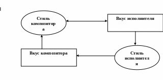 Художественный вкус не только обусловливает смену композиторского и исполнительского стилей, но также служит фактором, объединяющим эти феномены. Данная взаимосвязь, проявляясь как на уровне композиторского, так и на уровне исполнительского стилей, порождает цепь взаимосвязанных процессов. Происходит это следующим образом. Художественный вкус как «духовное образование» обусловливает определённый композиторский стиль. В свою очередь, последний осваивается личностью с помощью присущего ей вкуса, порождая новый феномен – исполнительский стиль.