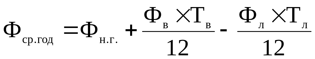 где Фн.г. – стоимость ОФ на начало года, руб. Фвв – стоимость введенных ОФ в течении года, руб. Флик – стоимость ликвидированных (выве денных) фондов в течении года, руб. Тв – число полных месяцев эксплуатации вновь введенных ОФ. Тл – число месяцев, остающихся со времени выбытия ОФ до конца года. |